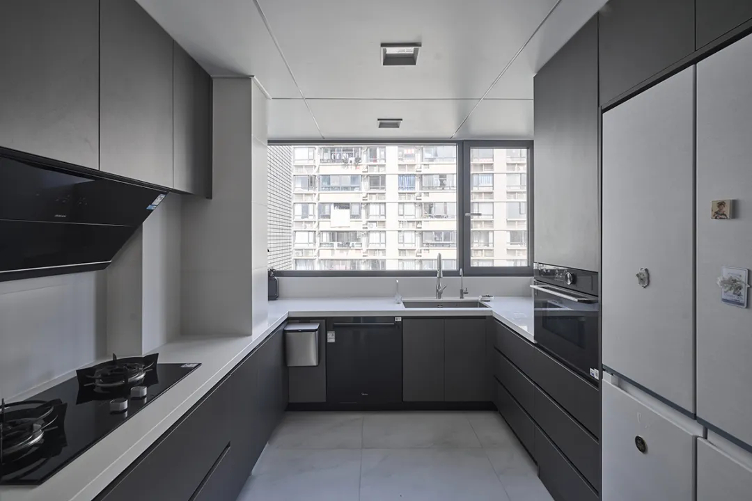 廚房設計得既整潔又實用,深灰色的上柜下柜與白色臺面的搭配,營造出一種溫馨而明亮的氛圍。櫥柜上方的抽屜和柜子提供了充足的儲物空間,使得廚房物品能夠有序擺放,方便取用。