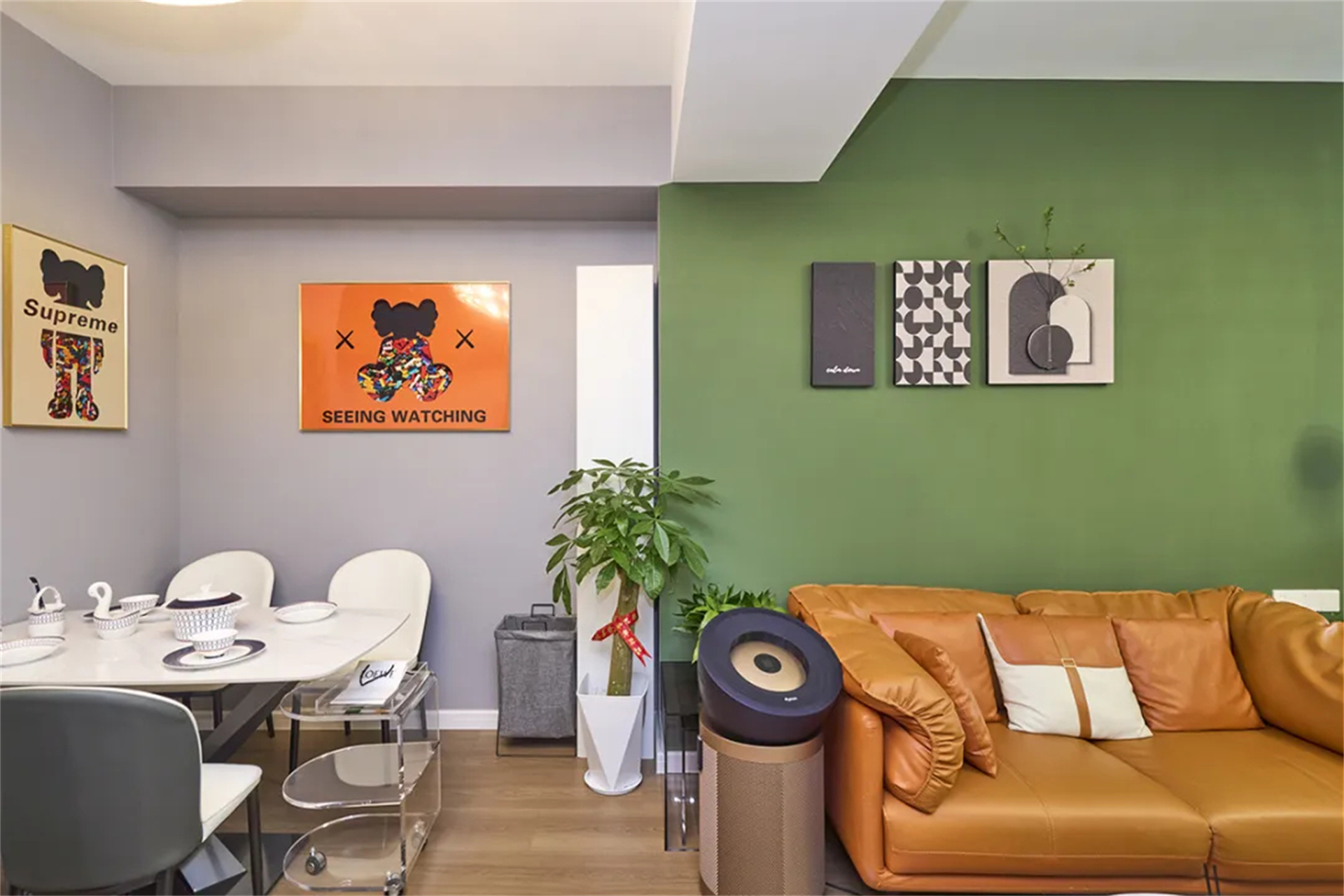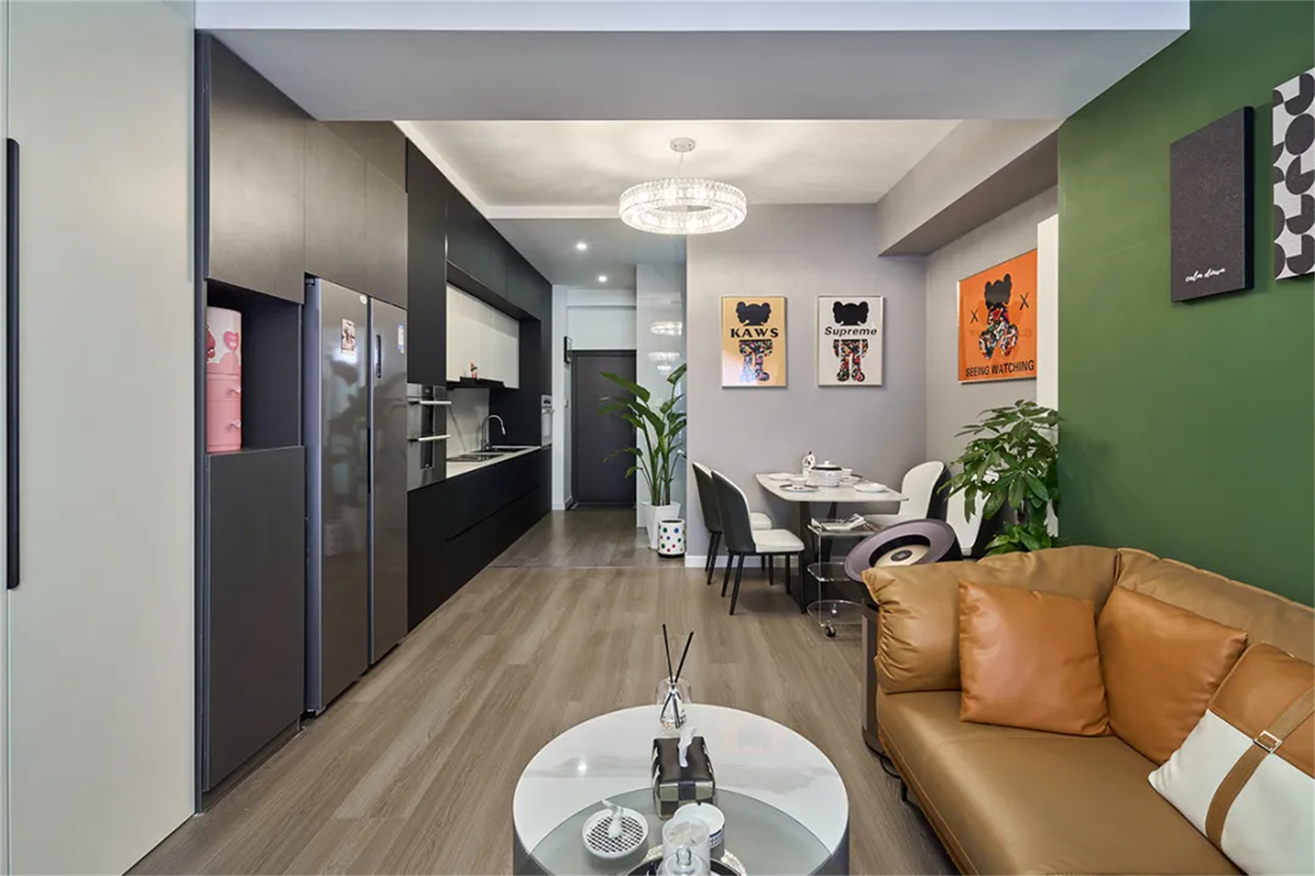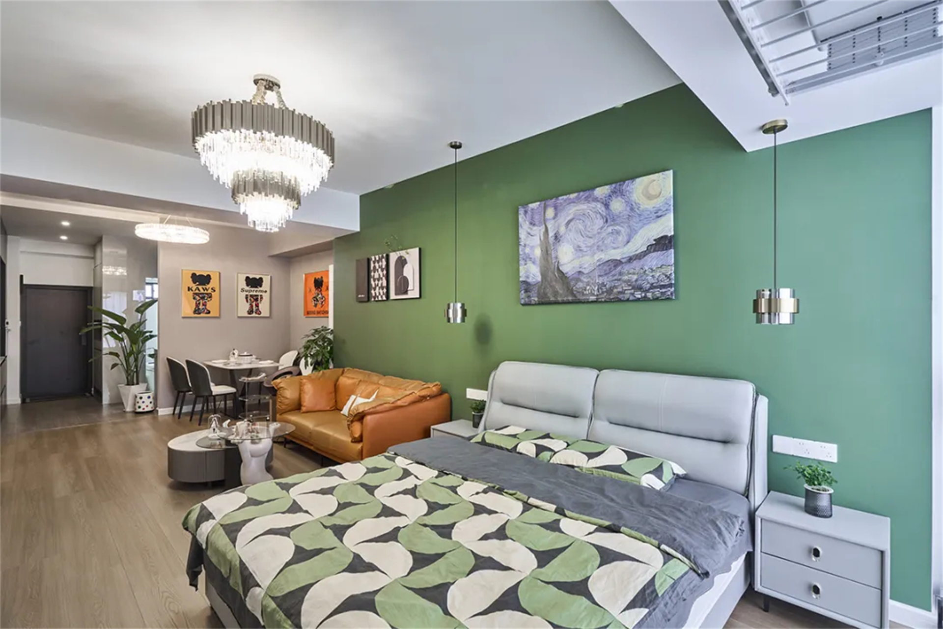 對比:客廳以黑色為主,搭配亮眼的沙發色彩和綠色植物,營造出內斂奢華的氛圍;臥室綠色墻面與灰色皮革相呼應,活力滿滿,窗簾設計也巧妙地讓空間瞬間明亮起來。
