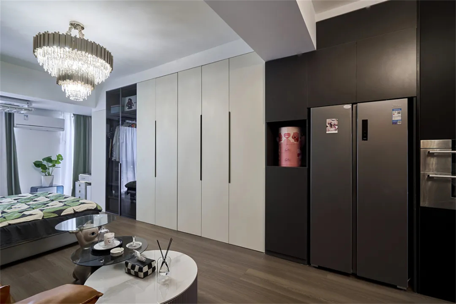 組合衣柜:臥室區域的組合衣柜設計巧妙,玻璃開門時尚大氣,內部分區合理,輕松滿足衣物的整理和取用需求,還為宅主打造了一個私密而實用的更衣空間。