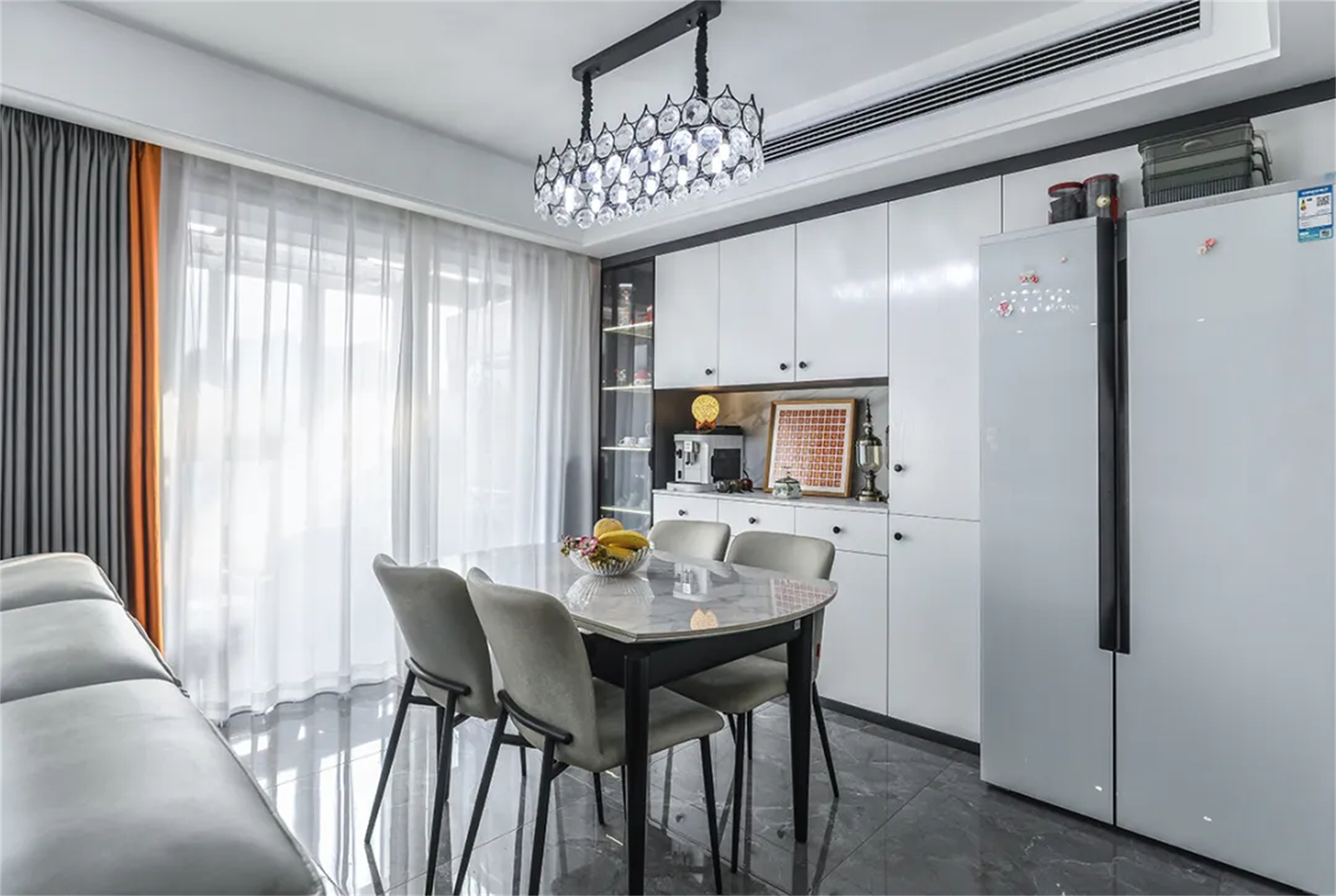1、客餐廳一體設計,并增加定制餐邊柜,不僅有效擴大了空間感,還增加了儲物容量,使整個空間更加開闊、大氣;
