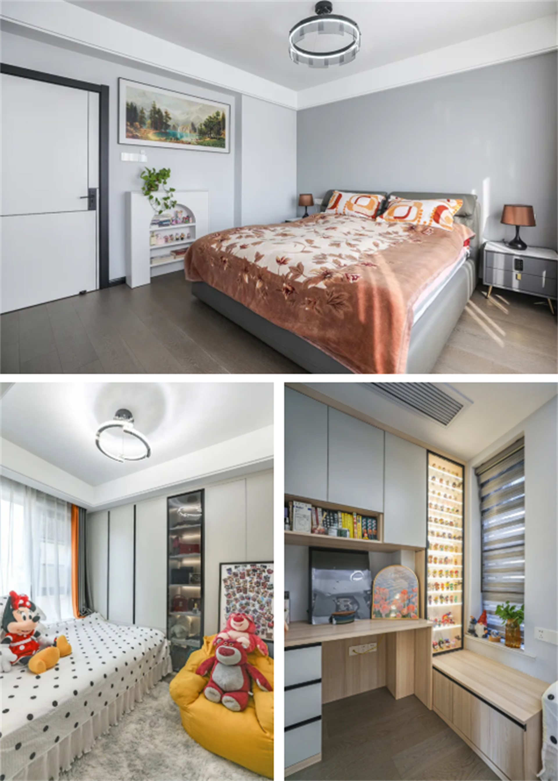 3、次臥設計為榻榻米一體柜加裝飾柜,既滿足了女兒偶爾居住的需要,又能作為儲物和展示裝飾物的空間,實現了空間的多功能利用;