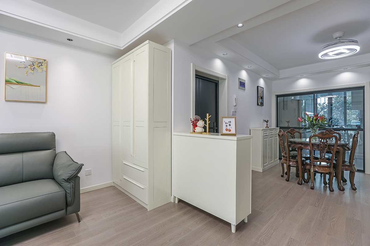 該房業(yè)主為大學(xué)退休的教授夫婦,為了讓他們的退休生活更加舒適,我們的裝修方案特別注重空間的功能性和布局合理性。客廳采用開(kāi)放式設(shè)計(jì),包括休息區(qū)、娛樂(lè)區(qū)和用餐區(qū)等。這種設(shè)計(jì)不僅使空間顯得更加寬敞和通透,還能滿(mǎn)足客戶(hù)不同的生活需求。