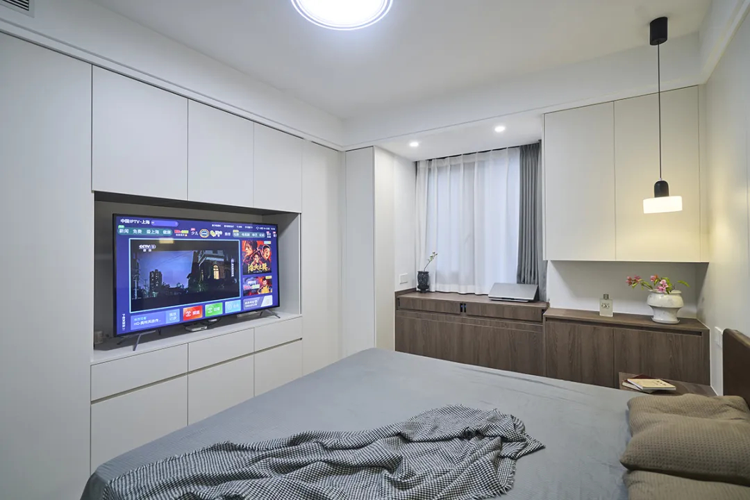 臥室以白色和灰色為主色調,營造出一個簡潔、明亮的睡眠環境。大床、儲物柜和床頭柜等家具均采用簡潔的線條和實用的設計,滿足了客戶的功能需求。
