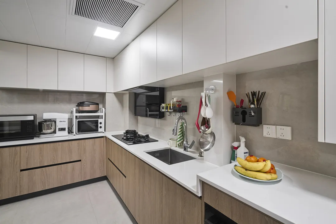 廚房以白色、木色和灰色為主色調,營造出簡潔明亮的烹飪空間。白色吊柜與灰色臺面相得益彰,下方黑色爐灶和烤箱的加入,不僅美觀大方,更提升了廚房的實用性。
