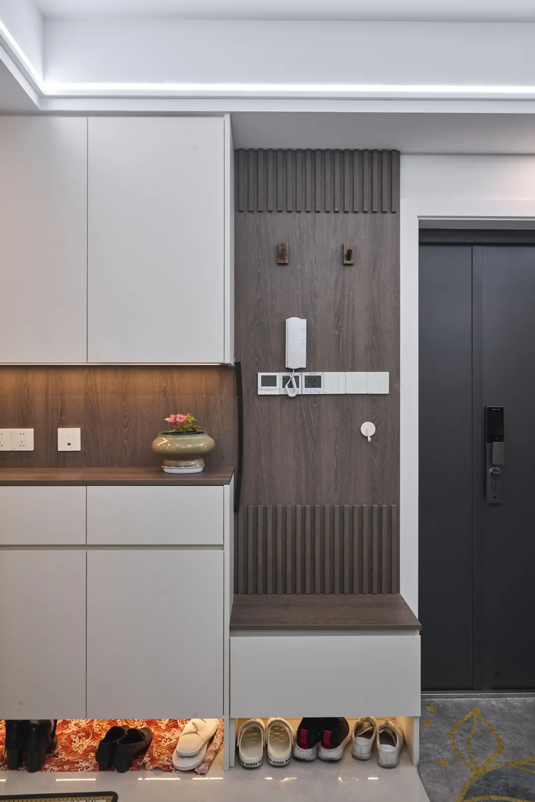 入戶玄關,我們根據房型和業主的功能需求,定制了一款獨特造型的玄關柜。巧妙利用了玄關的空間,既美觀又實用。人體工學換鞋凳設計方便業主日常出入時整理儀容。柜子下方鏤空,可以整齊地擺放多雙鞋子,滿足了業主對于鞋履收納的需求。