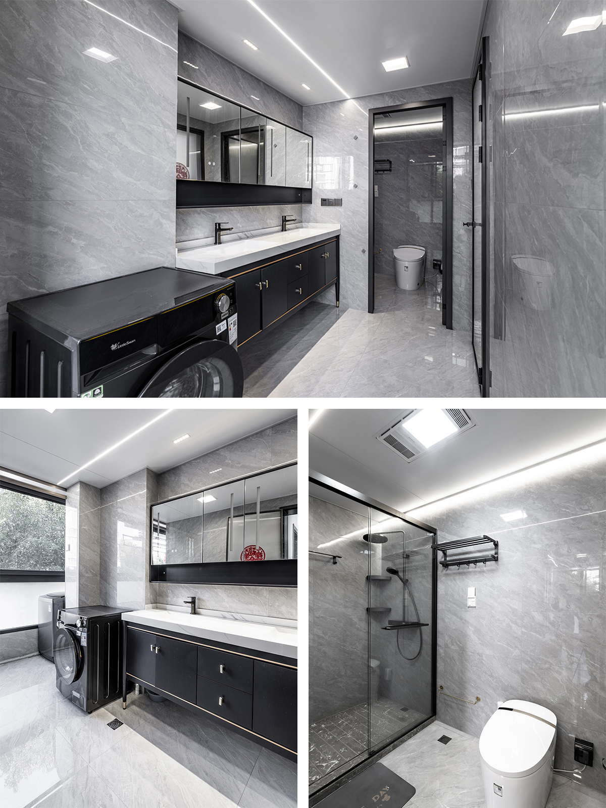 該衛(wèi)生間以灰色和白色為主色調(diào),搭配黑色元素,營造出簡約而優(yōu)雅的氛圍。三段式設(shè)計(洗衣區(qū)、淋浴區(qū)、獨立衛(wèi)生間)不僅提高了空間利用率,而且確保了各個功能區(qū)的獨立性,避免了使用沖突。大理石紋理的墻面和地板,提升了浴室的質(zhì)感和檔次。洗衣區(qū)與洗手池的結(jié)合,方便實用;淋浴區(qū)采用玻璃門隔斷,保持了空間的通透與干燥;獨立衛(wèi)生間則確保了私密性與舒適度。整個裝修設(shè)計為客戶帶來了極大的便利與享受。