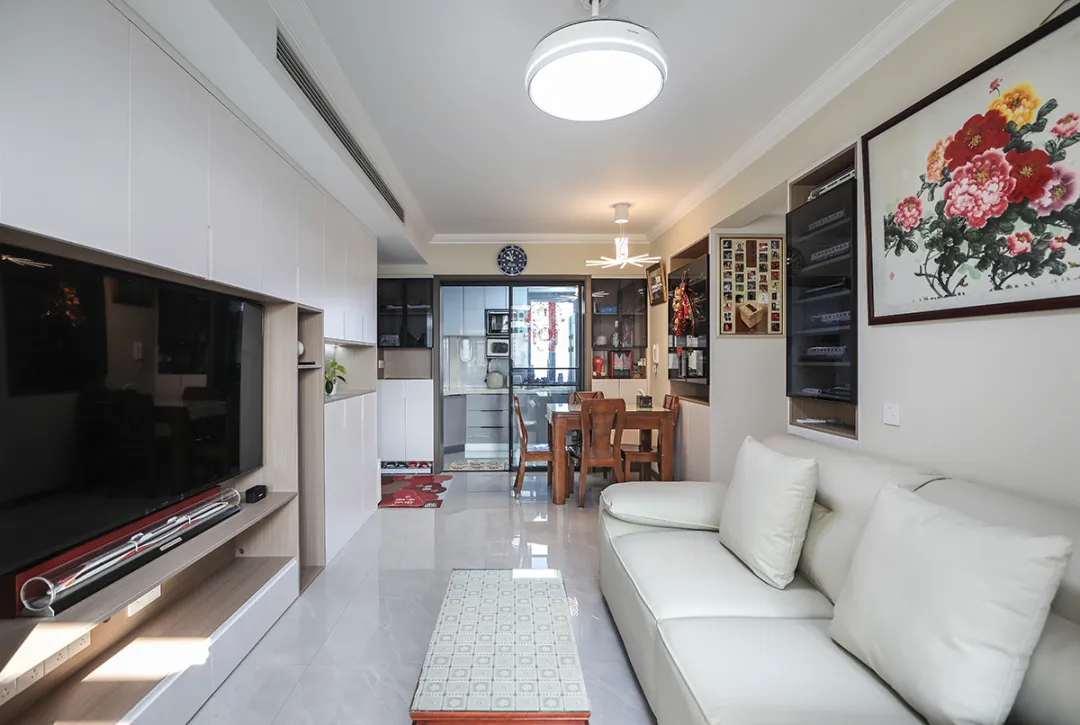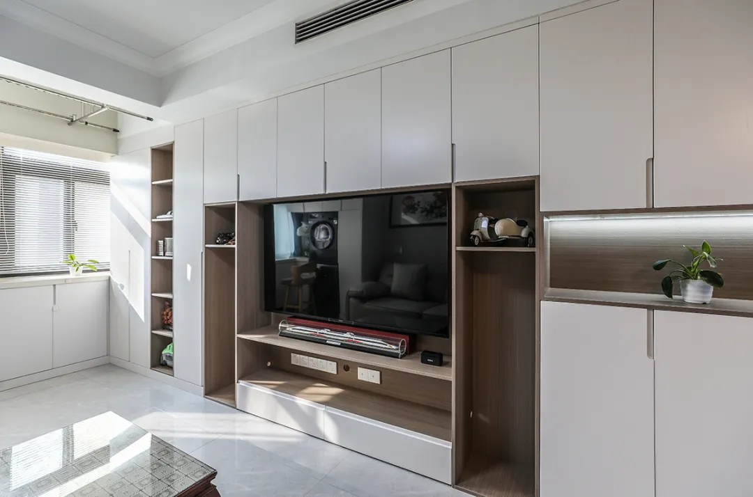 4、客廳與陽臺打通增加空間感,玄關鞋柜與電視柜一體化設計,陽臺設置家政柜等,充分利用每一寸空間......