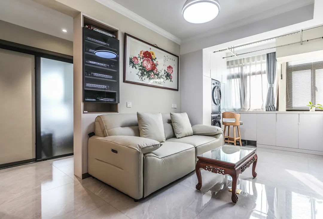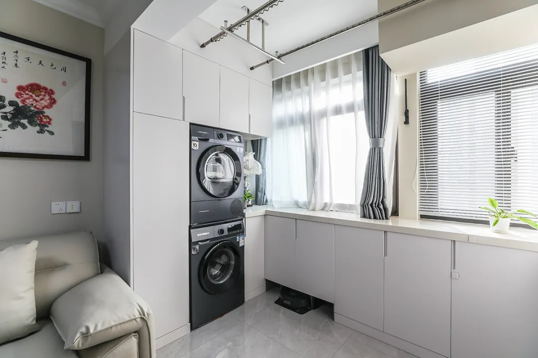 陽臺與客廳打通增大空間的同時也做了大量的儲物,洗衣機烘干機上下疊放,邊上做了一組家政柜放置吸塵器等家政用品,小小的空間有大大的利用。
