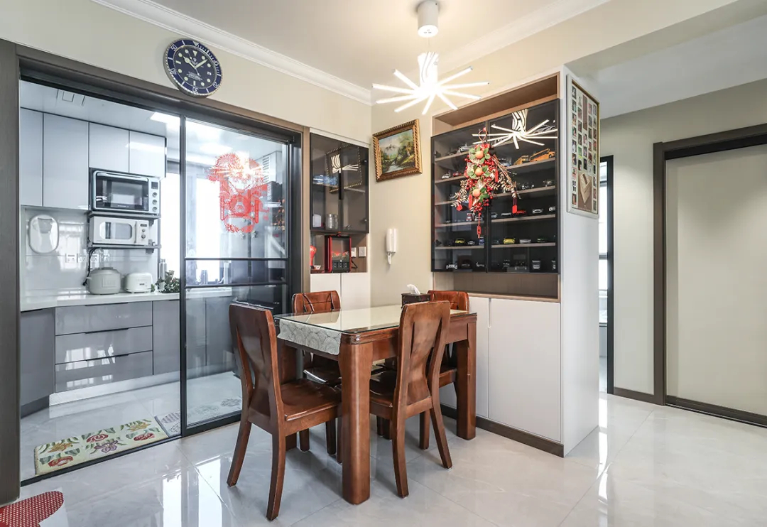 餐廳空間把非承重墻體打掉做成了餐邊展示柜,餐桌椅是業主原來的老家具保留的,整體氛圍簡單溫馨。