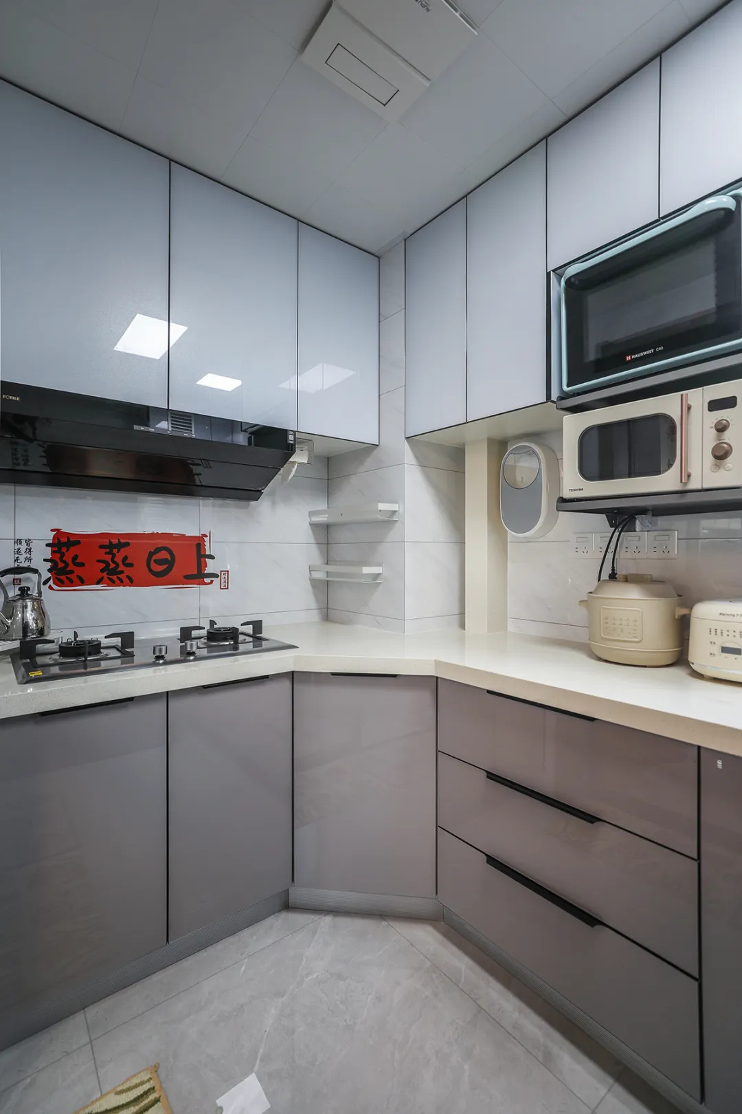 該套房子廚房空間很大,L型三面櫥柜,另外冰箱邊上也有操作臺,顏色簡潔明快,材質要干凈和好打理,白色的吊頂和米色的上櫥柜、深色的下櫥柜相呼應,石英石臺面干凈、好打理,各種廚房電器全部配齊,滿足主人制作各種美食的需求。