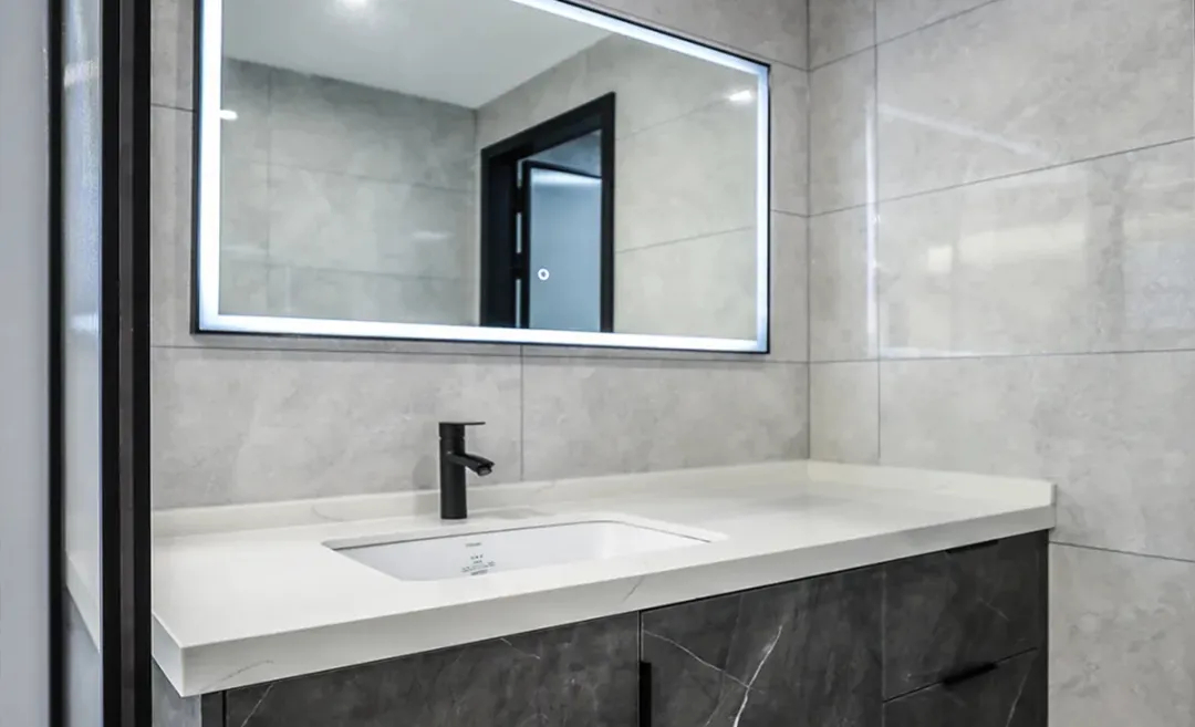 該衛生間浴室內的設計注重實用與美觀的結合,大型黑色鏡框的鏡子不僅滿足了日常使用的需求,還通過其簡潔的線條和反射效果,增強了空間的開闊感。洗手臺采用大理石紋理,既美觀又耐用,與整體風格相得益彰。