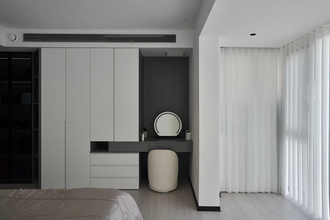 建議在臥室柜體設計中,盡量保持整體的簡潔與流暢。可以在底部設計抽屜,用于收納內衣、襪子等小件物品,方便日常取用。不建議在頂部設置柜格,因為頂部空間通常較高,使用頻率低,容易積灰且難以清理。