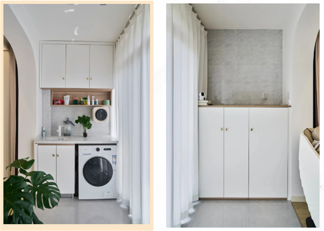 現在多數人會把洗衣機放置在陽臺,因為上海多數陽臺為高墻,視野并不開闊,所以主要功能為洗衣晾曬。我們可以在定制儲物空間的同時,設置小水池便于洗滌小件衣物,讓洗衣功能更進一步。