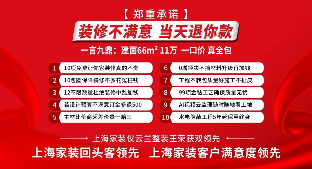 云蘭整裝王專做上海家裝22年,現回頭客及轉介紹業務已占業務總量的4成以上。上海家裝回頭客領先,上海家裝客戶滿意度領先,雙領先口碑品牌。一直堅持免費上門量房,免費360°效果設計,免費清單式報價......10免10包12不限。好而不貴,找云蘭整裝王,真靠譜!