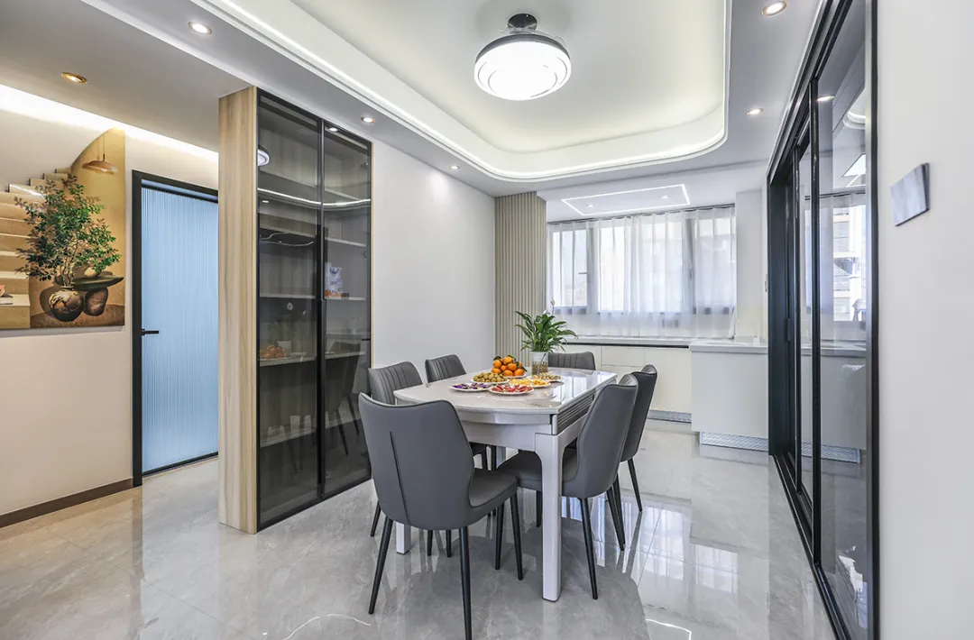 餐廳的設計同樣注重空間的擴展和實用性。我們拆除了墻體和移門,使餐廳空間更加開闊,淺灰色地磚的選用,保持了色彩和造型上的簡潔大氣。