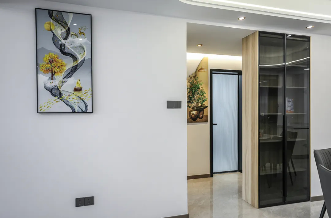 玄關的設計注重功能性和美觀性。我們?yōu)闃I(yè)主定制了鞋柜,并巧妙地隱藏了一個儲藏間,使整體動線更加完美,空間感得到了顯著提升。