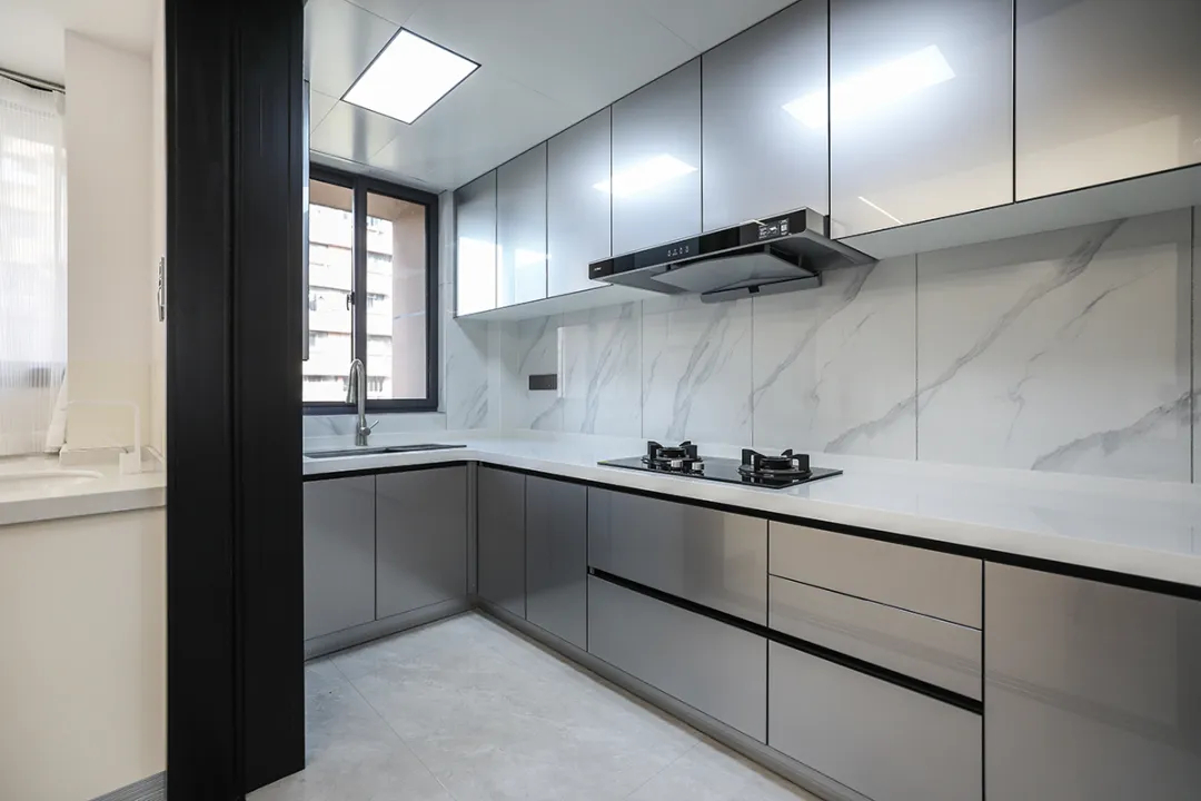 3、廚房設計L型櫥柜,優(yōu)化操作動線,使洗、切、炒過程順暢;