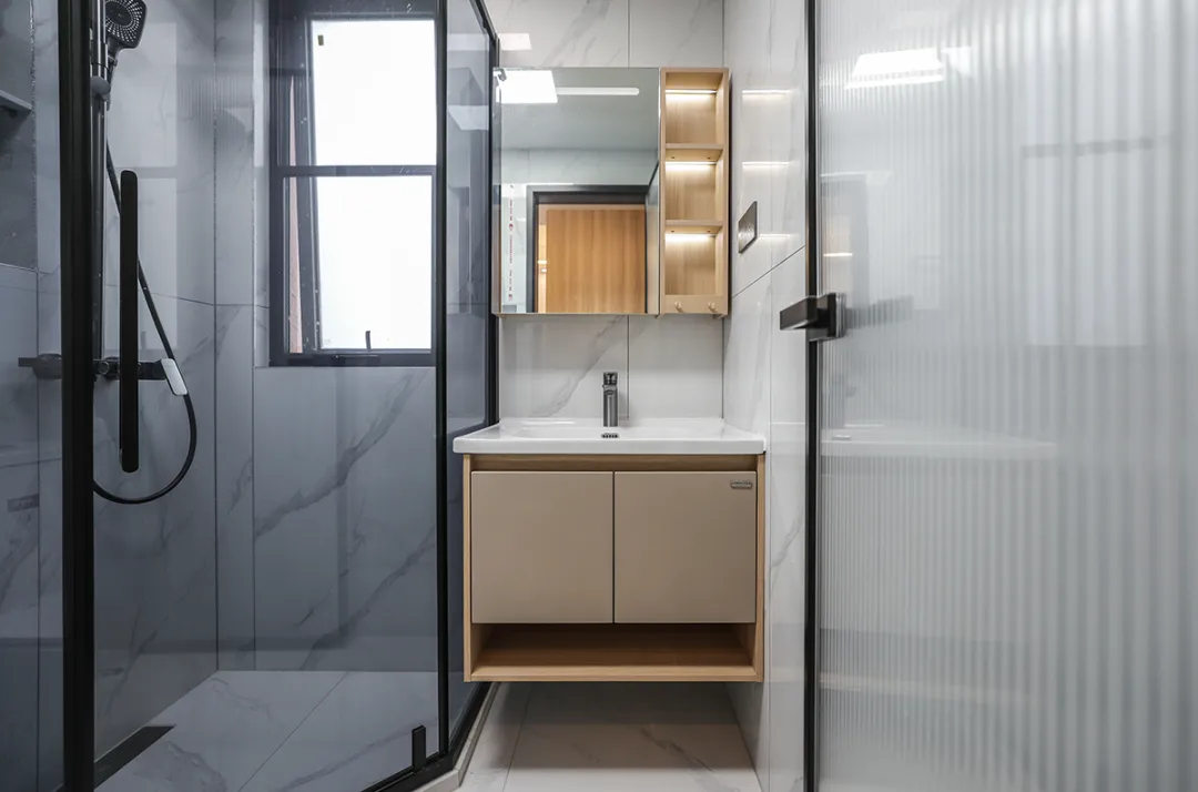 客衛(wèi)采用了一字下沉式淋浴房和智能馬桶,墻地一體磚和白色吊頂,以及鈦合金移門,展現(xiàn)了高檔次的生活品味。主衛(wèi)則采用了鉆石淋浴房和黑色邊框長虹玻璃門,增加了收納空間,同時保持了空間的協(xié)調統(tǒng)一。
