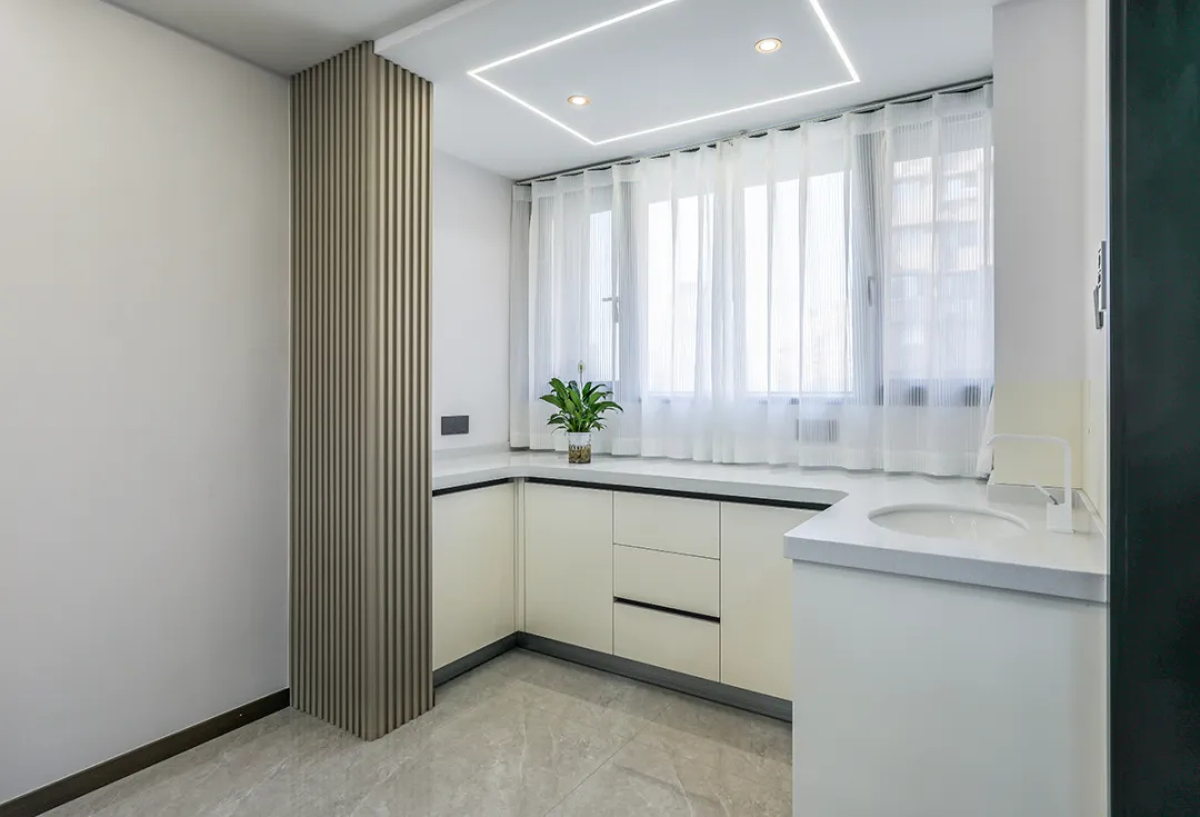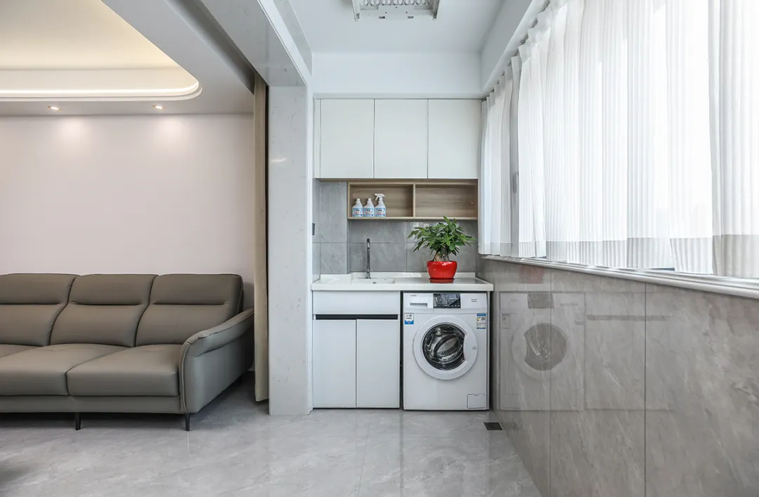 南陽臺被設計為晾曬衣物的場所,配備了洗衣機整體柜,而北陽臺則被改造成了西水吧臺,采用了格柵造型,既實用又美觀。