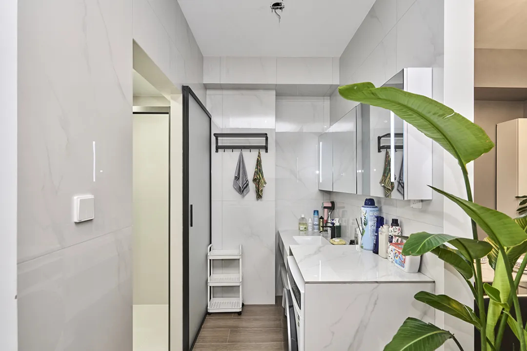對于陽臺等容易接觸到水的地方,可以采用更巧妙的設計。比如,將乳膠漆墻面改為貼淺灰色瓷磚。瓷磚不僅防水防潮,而且清潔起來也非常方便。即使晾衣服時不慎打翻水盆,水順著墻面流下來,擦干后連水印都不會留下。