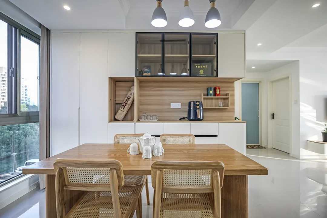 說(shuō)到個(gè)性化,就不得不提那些讓人眼前一亮的柜體設(shè)計(jì)。比如在餐邊柜的設(shè)計(jì)上,外部采用大面積的奶油白色,給人一種柔和治愈的視覺(jué)感受;而內(nèi)部則選擇細(xì)膩的豎直淺色原木,一深一淺相互呼應(yīng),層次感瞬間拉滿。