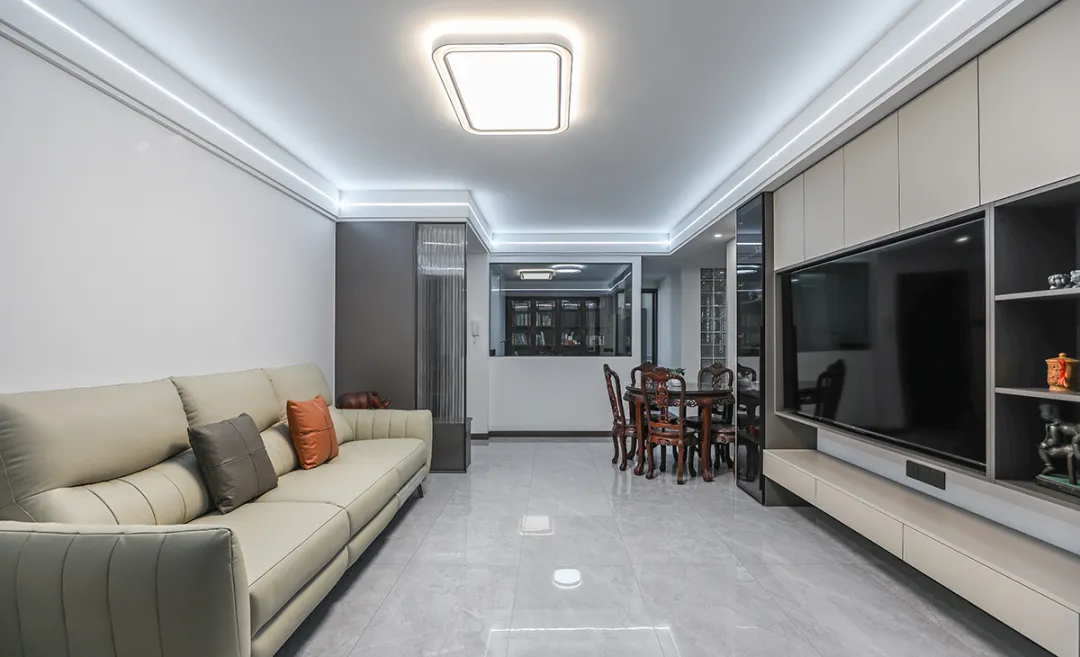 楊浦區(qū)黃興路1717弄:該客廳以簡約而不失奢華的線條勾勒空間。灰色與白色的抱枕搭配長形沙發(fā),展現(xiàn)出低調(diào)的商務(wù)風(fēng)范。圓形玻璃茶幾與黑色電視柜的組合,不僅實(shí)用且充滿設(shè)計(jì)感,彰顯出主人的獨(dú)特品味。大窗戶引入自然光線,讓空間更加明亮通透。