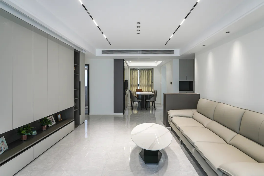 普陀區(qū)鎮(zhèn)坪路176弄:該客廳以白色與灰色的主色調(diào),營造出簡約而不失高雅的商務(wù)氛圍。長形沙發(fā)與圓形咖啡桌的搭配,既滿足了商務(wù)洽談的實(shí)用性,又不失時(shí)尚感。嵌入式電視柜與深色儲(chǔ)物柜的設(shè)計(jì),不僅節(jié)省空間,還展現(xiàn)出主人的細(xì)致品味與高效生活態(tài)度。