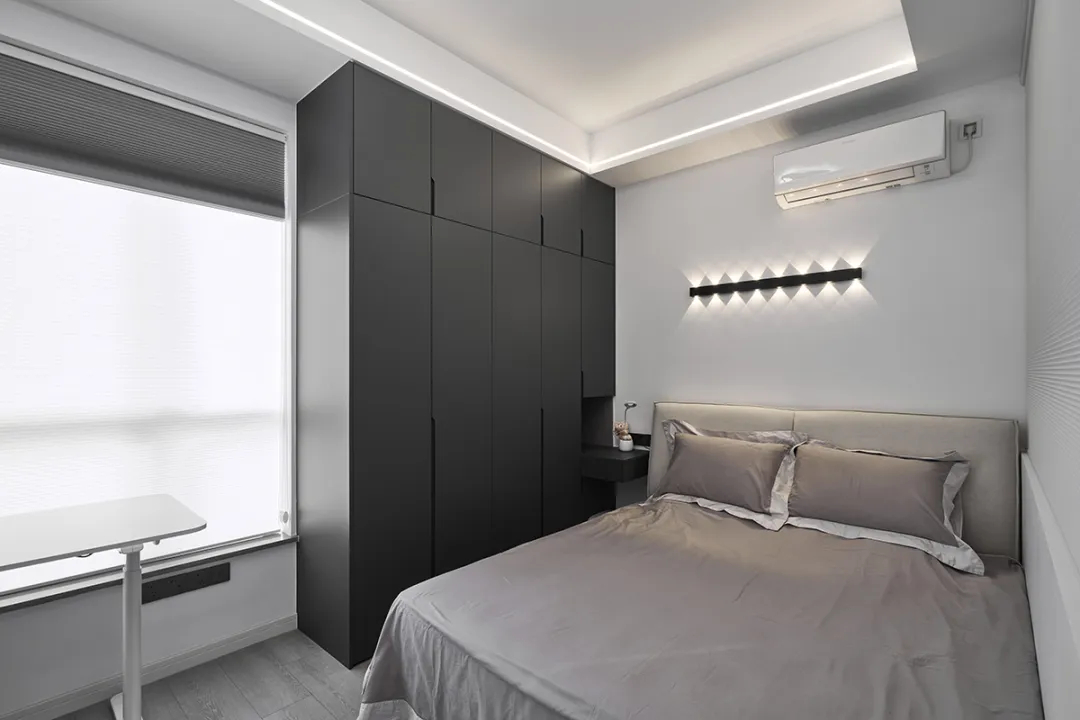 盡管臥室面積不大,但通過合理的設計,充分利用了空間,滿足了各種需求。衣柜延長的床頭柜摒棄了傳統的老式床頭柜,形成一個整體的感覺,不僅節省了空間,還增加了美觀度。
