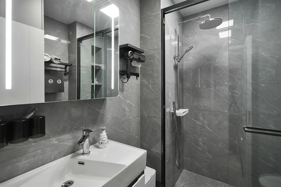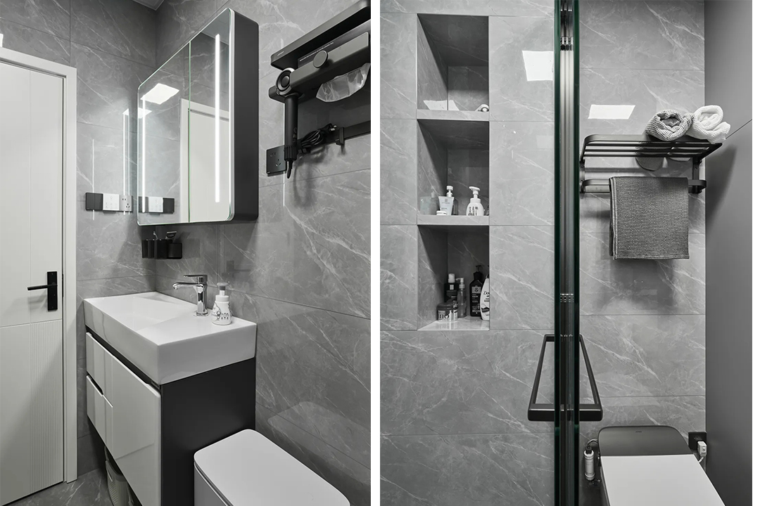 衛生間采用了干濕分離的設計,能夠滿足兩人同時使用,提高了生活的便利性。壁龕的巧妙設計節省了原本不大的淋浴區域,使得空間利用最大化,讓衛生間看起來更加整潔有序。
