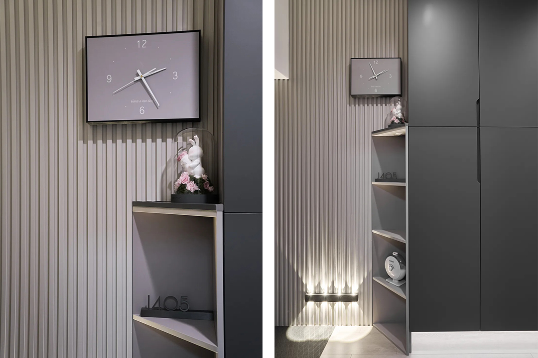 簡易鞋柜與定制柜一體化設計,外觀利落大方,既滿足收納需求又提升玄關顏值。墻燈與射燈巧妙布局,不僅清晰照亮鞋柜等區域,更在光影交織間,打造溫馨的家居氛圍感。