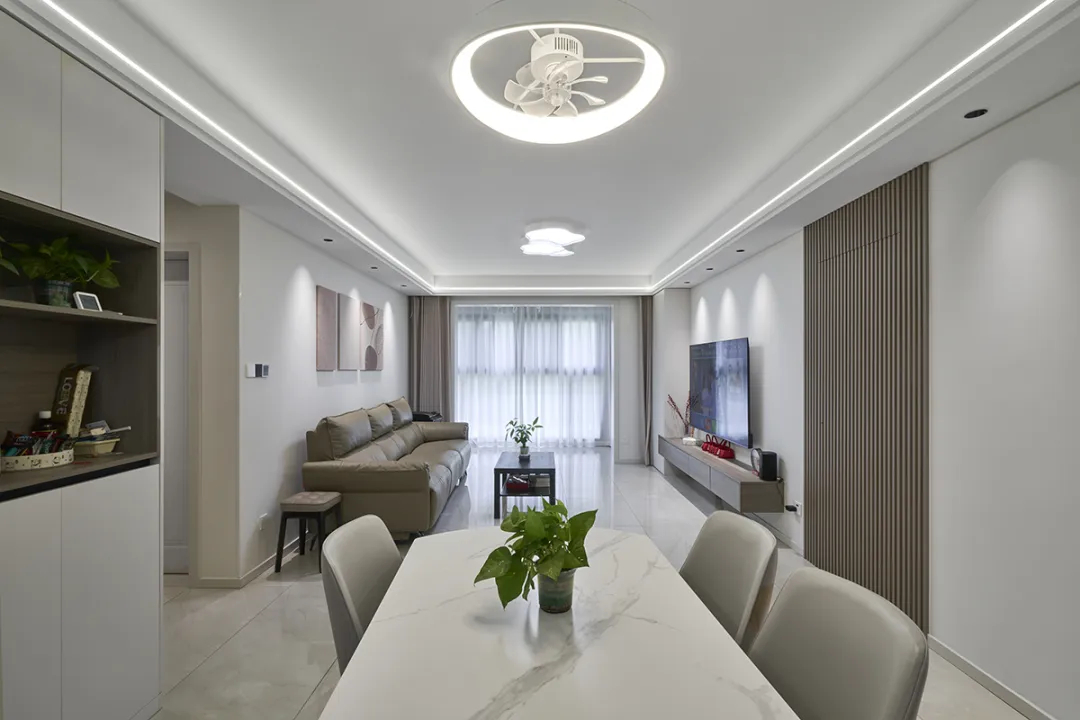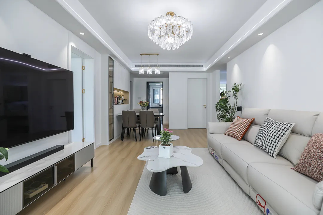 松江區明華路1177弄:客戶希望客廳空間寬敞明亮,同時需要有現代感和藝術感。我們采用了現代簡約風格,以白色為主色調,搭配木質地板和現代家具,營造出寬敞明亮的氛圍。水晶吊燈和藝術感的茶幾為空間增添了現代感和藝術氣息。大面積的窗戶和簡潔的電視墻設計,不僅增加了空間的通透感,也滿足了客戶對現代感的追求。