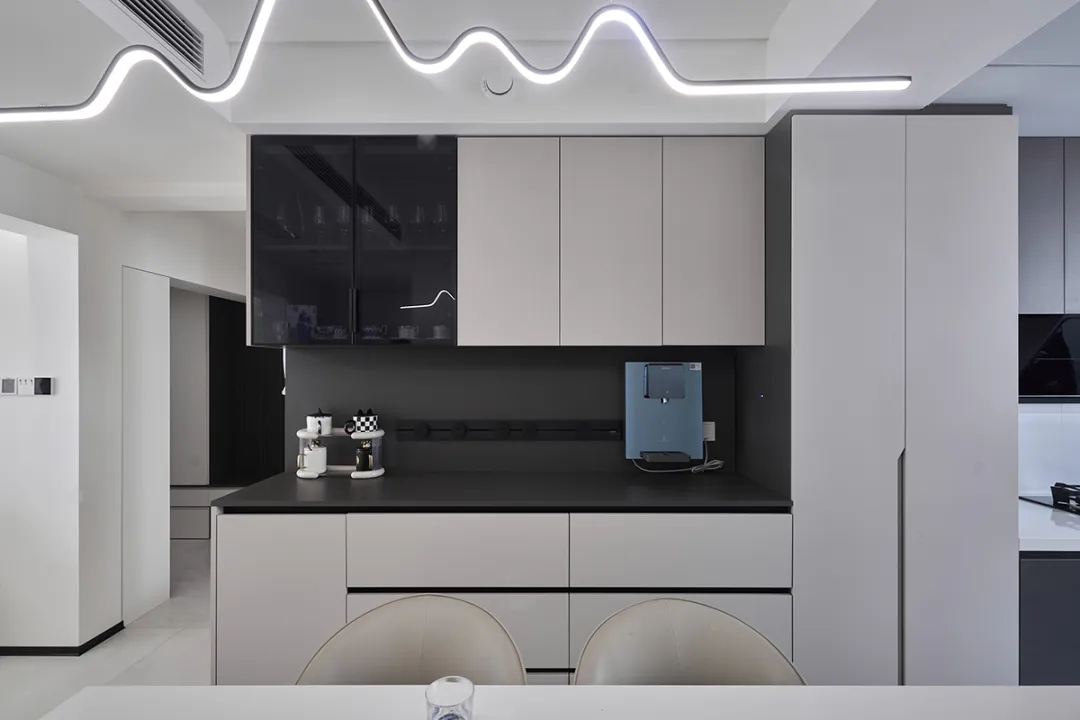 餐廳空間比較方正,整面餐邊柜和餐桌顏色呼應,黑色極窄邊框玻璃門增添了夢幻感,頂面曲線吊燈成為空間的亮點。