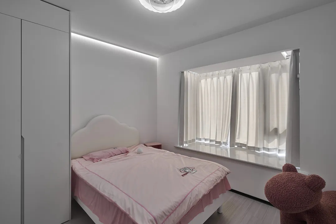 女兒房的設計簡潔實用,大飄窗的設計讓空間感得到延伸,暗藏的氛圍燈和灰色地板、黑色踢腳板與白色墻面的搭配,形成了有序的明暗對比。