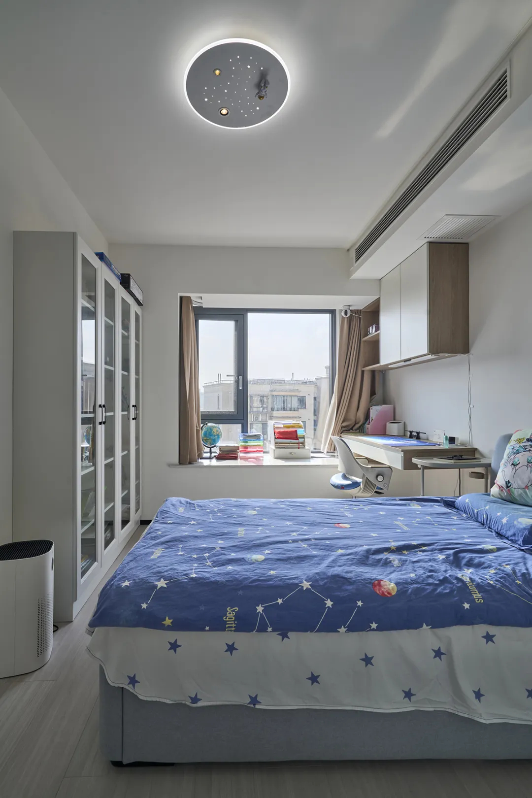 2、根據家庭成員需求定制個性空間,主臥配備男主辦公區、女主梳妝臺和衣柜,做女兒房配置大飄窗和氛圍燈,兒子房設計懸挑寫字臺和書柜,確保舒適便利;