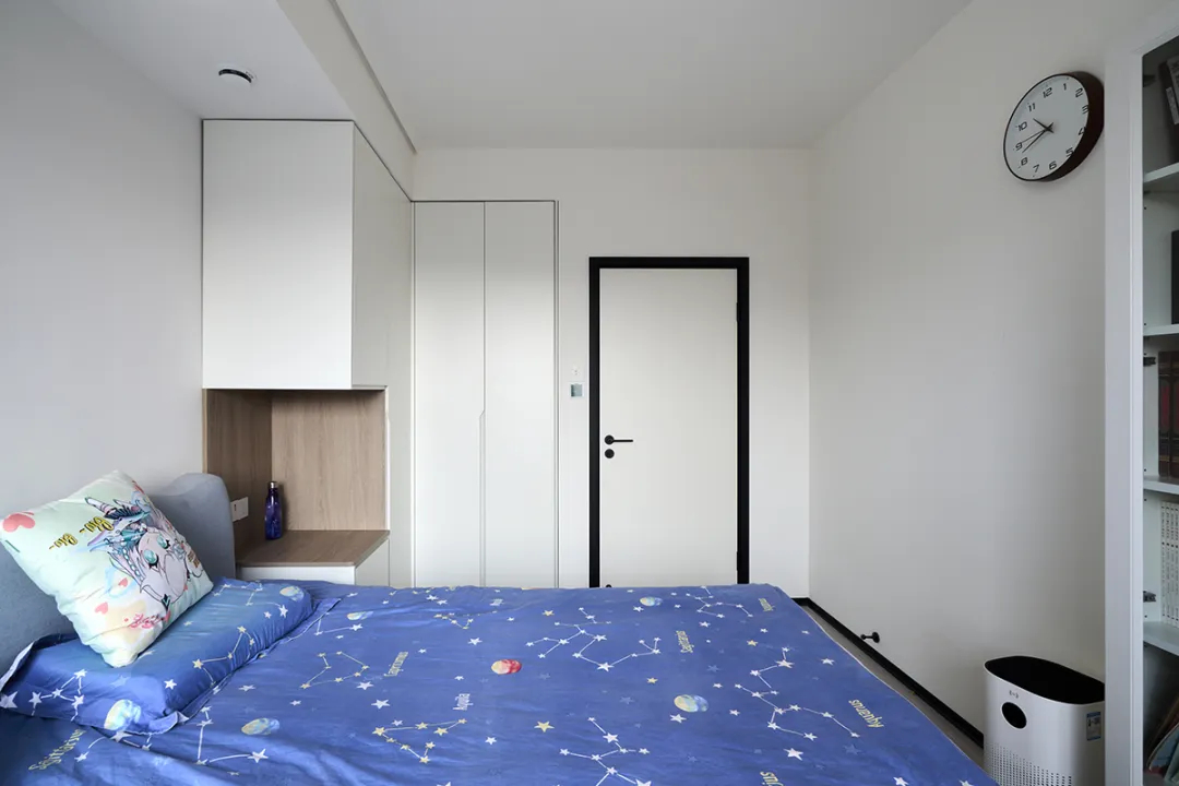 男孩房間的設計同樣考慮到了空間的利用和收納需求。我們利用大飄窗設計了一個懸挑寫字臺,并在對面設置了一排書柜,有效收納了書籍。