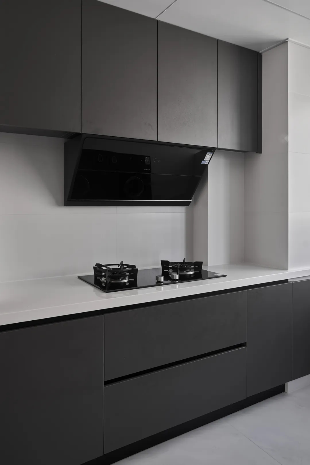 廚房設計得既整潔又實用,深灰色的上柜下柜與白色臺面的搭配,營造出一種溫馨而明亮的氛圍。櫥柜上方的抽屜和柜子提供了充足的儲物空間,使得廚房物品能夠有序擺放,方便取用。
