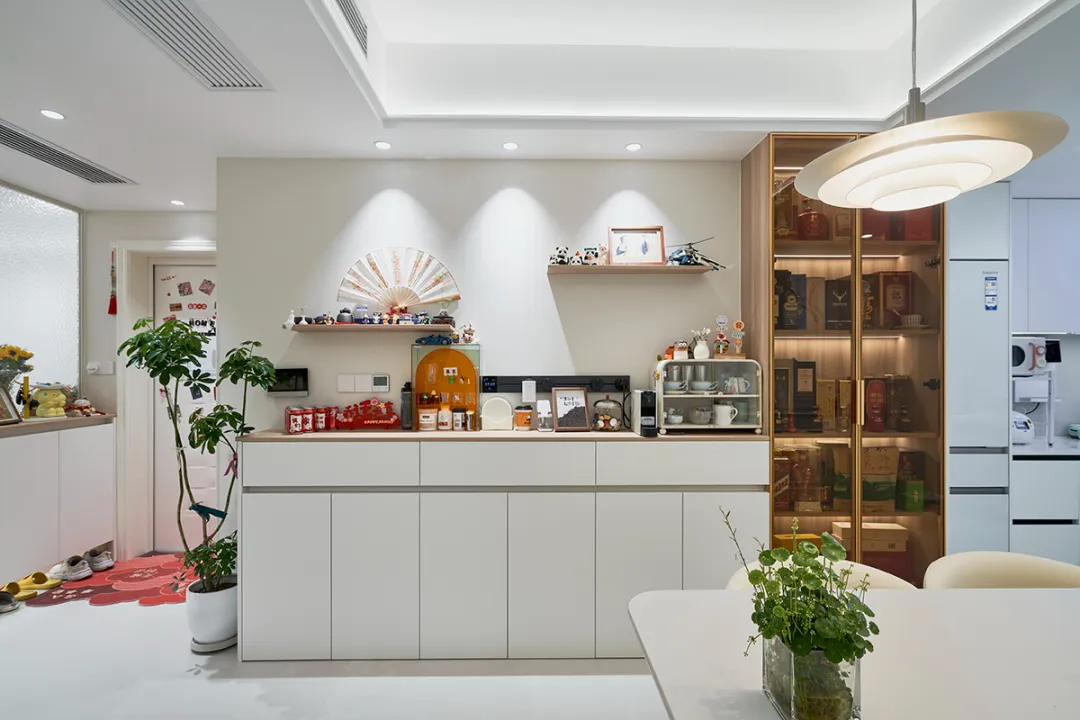 其實(shí),開(kāi)放格并不是一無(wú)是處,關(guān)鍵是要合理設(shè)計(jì)。比如在鞋柜的位置,做個(gè)兩層的開(kāi)放格就挺實(shí)用。第一層放拖鞋,第二層放外穿鞋,高度剛好合適,方便又實(shí)用。而且在開(kāi)放格頂部加個(gè)燈帶,下面再做個(gè)抽屜,放鑰匙、快遞單這類(lèi)小物件,簡(jiǎn)直不要太方便。餐邊柜也可以設(shè)計(jì)一個(gè)開(kāi)放格,用來(lái)放花瓶、裝飾品,或者作為小家電的收納區(qū),這樣拿東西不用開(kāi)柜門(mén),既方便又美觀。