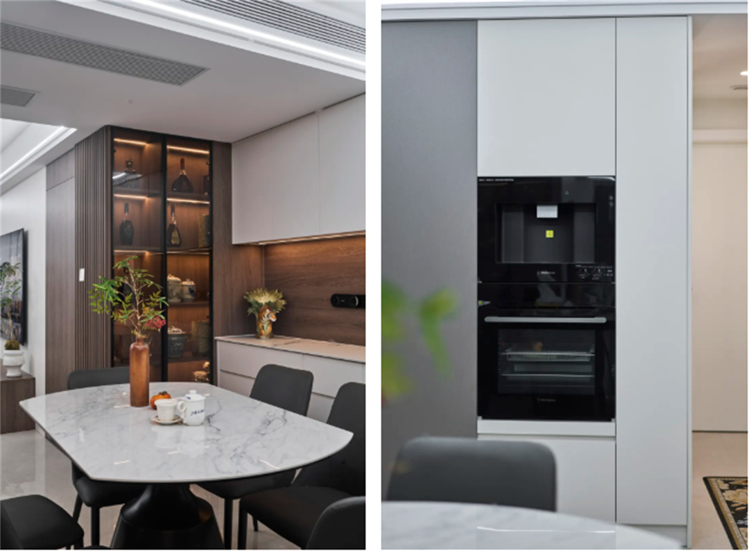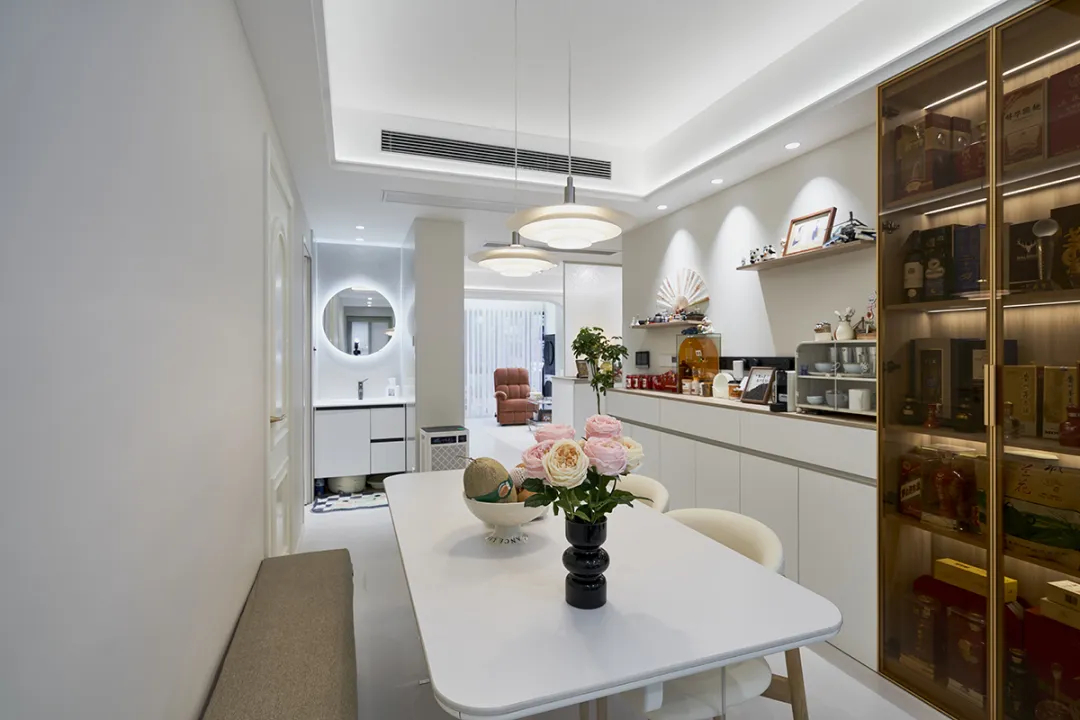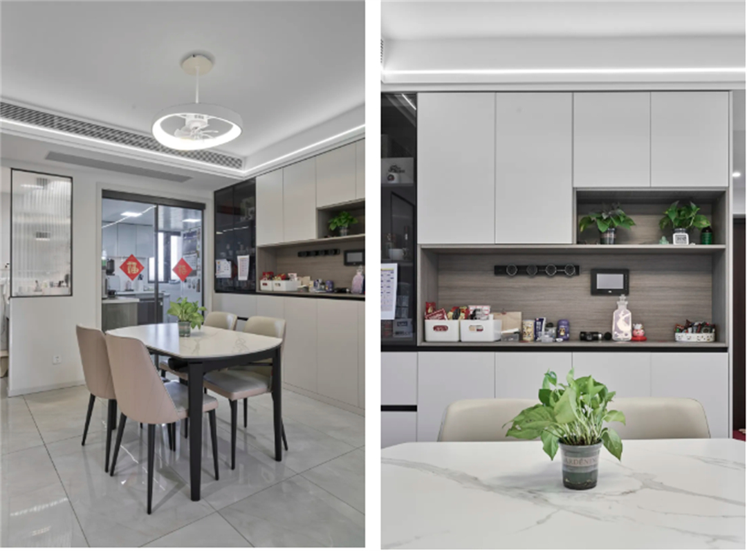 場北路551弄:該套房餐廳特別定制餐邊柜,白色柜體搭配玻璃門,既展現了物品的整齊擺放,又增添了空間的通透感。中間開放式儲物格便于取放常用物品,上方封閉柜門則提供了充足的隱藏儲物空間。