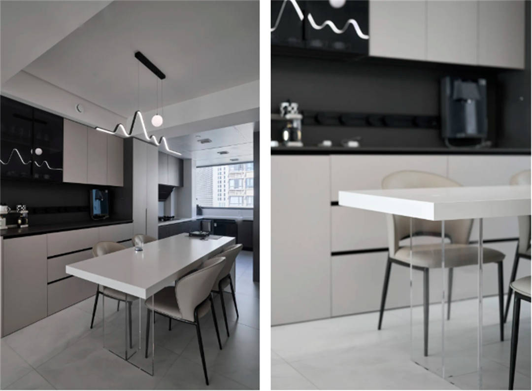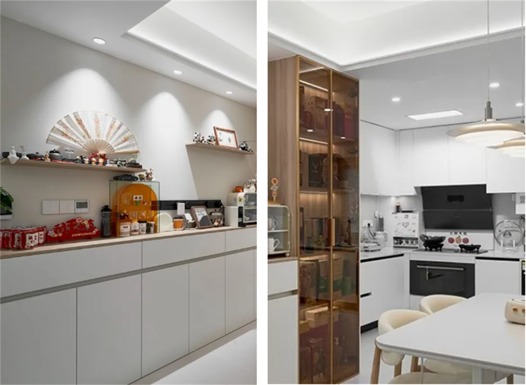 涵青路100弄:這套房的餐廳以白色為主調的餐邊柜設計既美觀又實用。柜體線條簡潔,玻璃門展示區增添了一絲輕奢感,同時提供了充足的儲物空間。開放式擱架方便展示裝飾品和常用物品,內置照明增強了視覺效果。