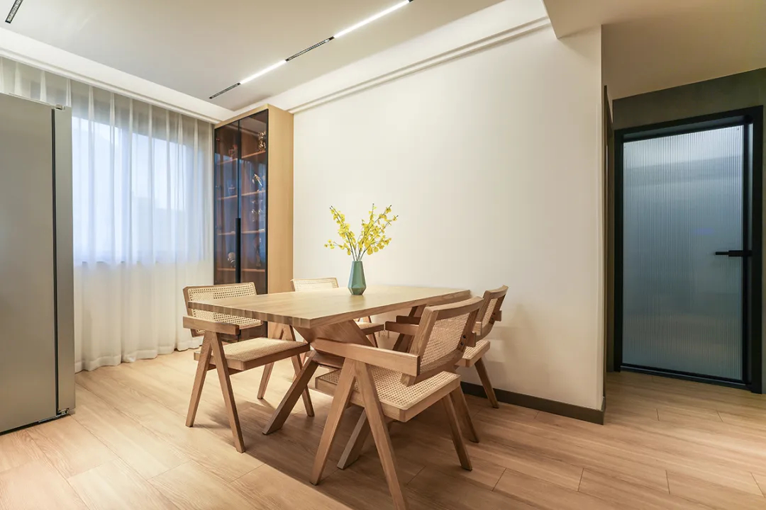 魯班路277弄:該套房以簡約現代風格為主,餐廳處白色與木紋的搭配,營造出溫馨而不失格調的氛圍。餐邊柜不僅提供了充足的儲物空間,其內嵌的酒柜和展示架更增添了裝飾性,使得餐廳功能與顏值雙在線。