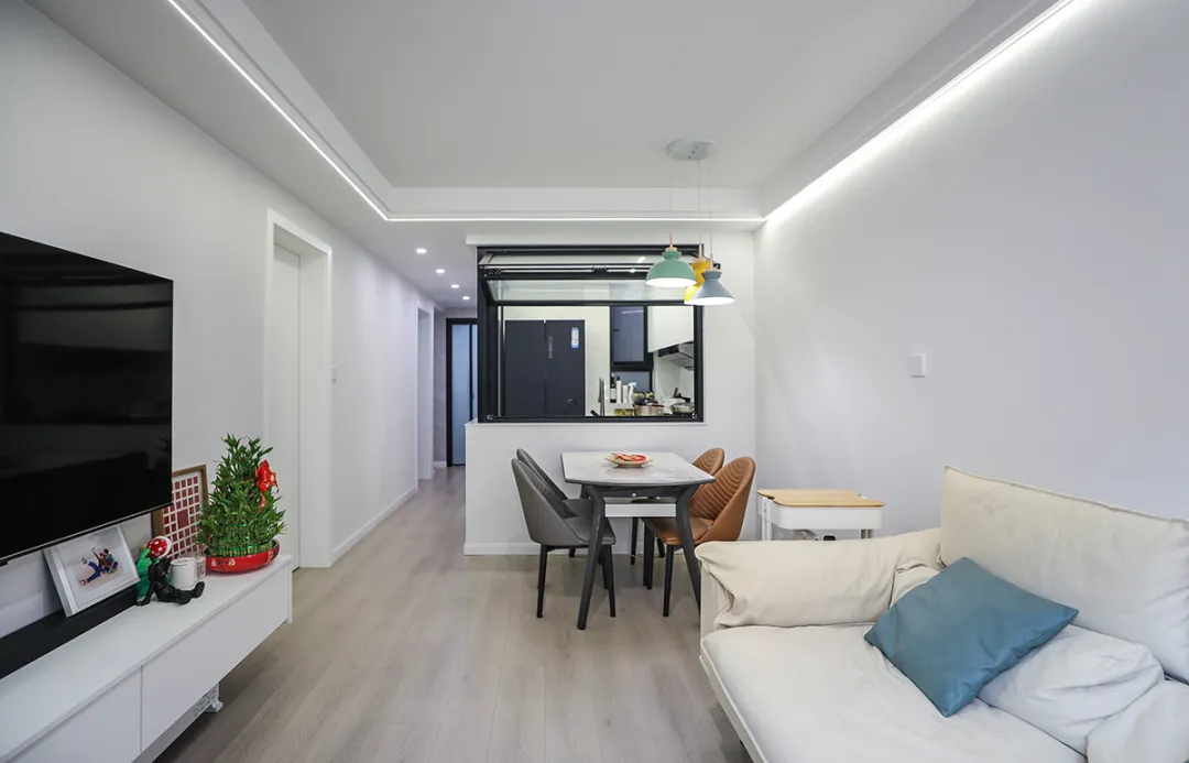 廚房連著生活陽(yáng)臺(tái),可以直接利用玻璃窗來(lái)改善采光。要是廚房和陽(yáng)臺(tái)之間的隔斷是玻璃窗,那就太完美了,光線可以直接從陽(yáng)臺(tái)透進(jìn)來(lái),廚房瞬間變得明亮。