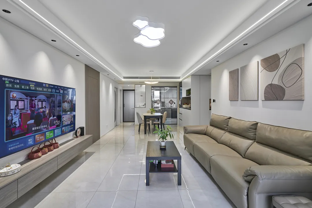 現代簡約風格:該套房位于寶山區場北路551弄,面積為130㎡,業主是一對年輕夫妻。作為中等戶型的房子,業主想要做出三室二廳二衛一廚,還希望每個空間顯大開闊。該套房裝修風格為現代簡約,設計師以簡潔、干練的設計語言來提升整體的美觀度,同時盡量減少對空間的占用,確保在增設功能區域的同時,依然保持空間的寬敞度。