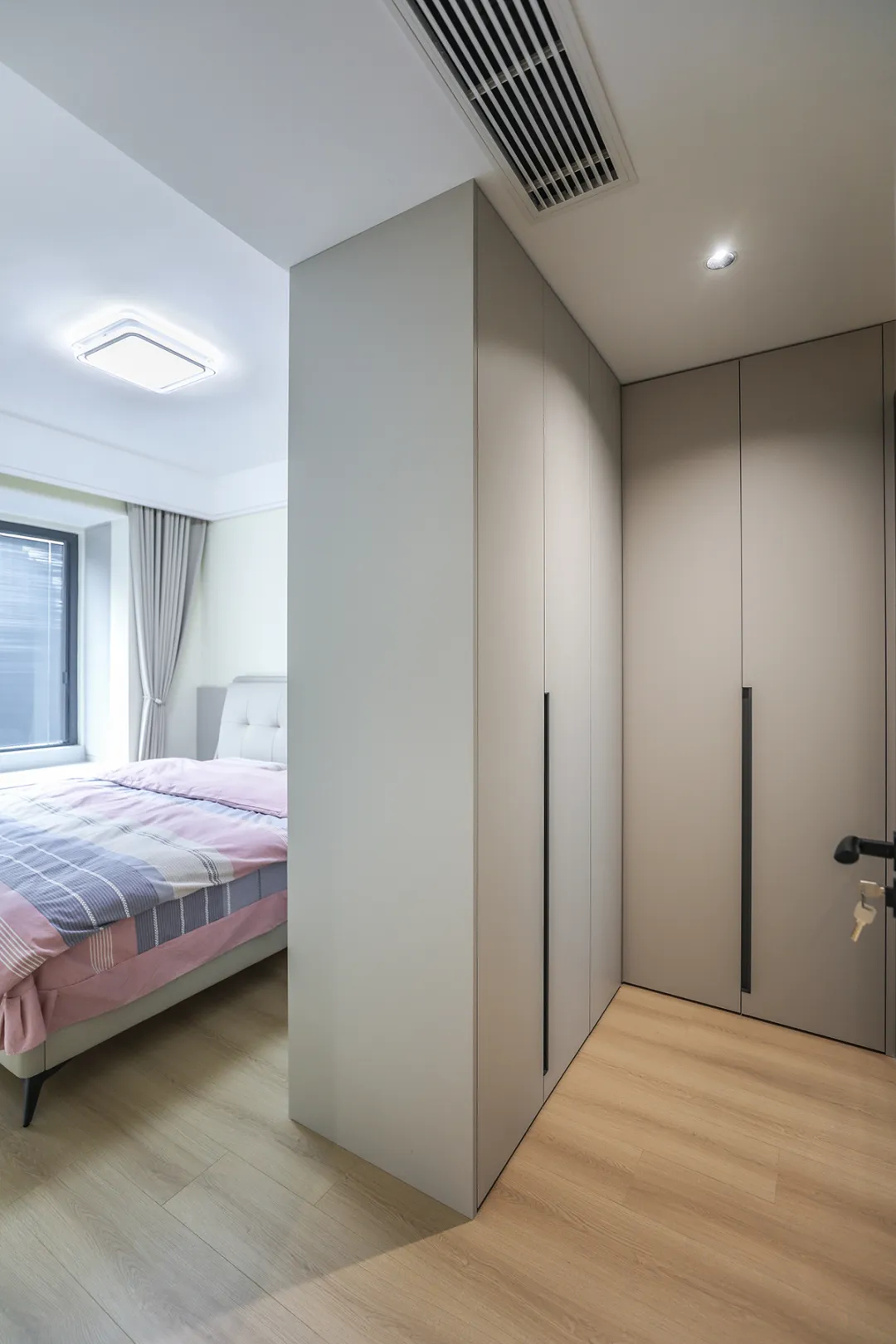 沒有獨立衣帽間,也別愁。臥室要是夠大,做轉角衣柜,里面可以按照長短衣物、配飾來分區,收納量完全不輸衣帽間。