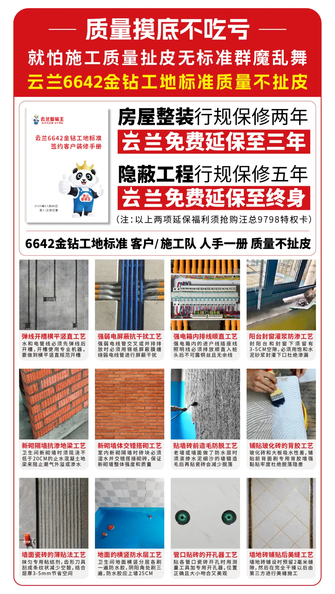 在施工質量方面,云蘭整裝王制定“金鉆工地”標準,更以此為支撐匯編“6642金鉆工地歐標體系”,對每一個裝修環節進行精細化管理,從而保障裝修質量的穩定與可靠。