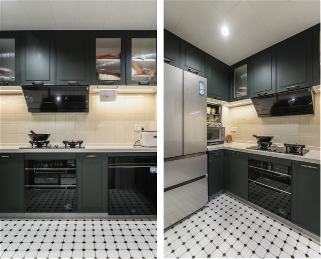 該套房廚房定制了褐色上下柜,高柜主要用于儲藏,低柜則根據業主烹飪需求設計,可內嵌家電,保持家居整潔。地板選用了落字棋盤格地磚,設計感十足,防滑且利于水漬揮發,實用又安全。