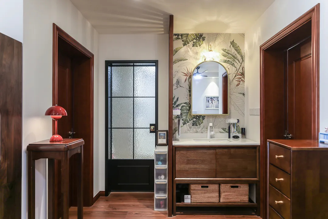 該套房衛生間的設計巧妙,實現了干濕分離。淋浴區通過一扇玻璃門與外部隔開,既保持了空間的通透感,又有效防止水花四濺,確保了干區的干燥和清潔。深色木質家具與白色臺面的搭配,營造出溫馨典雅的氛圍,墻上的熱帶植物壁紙增添了自然氣息。