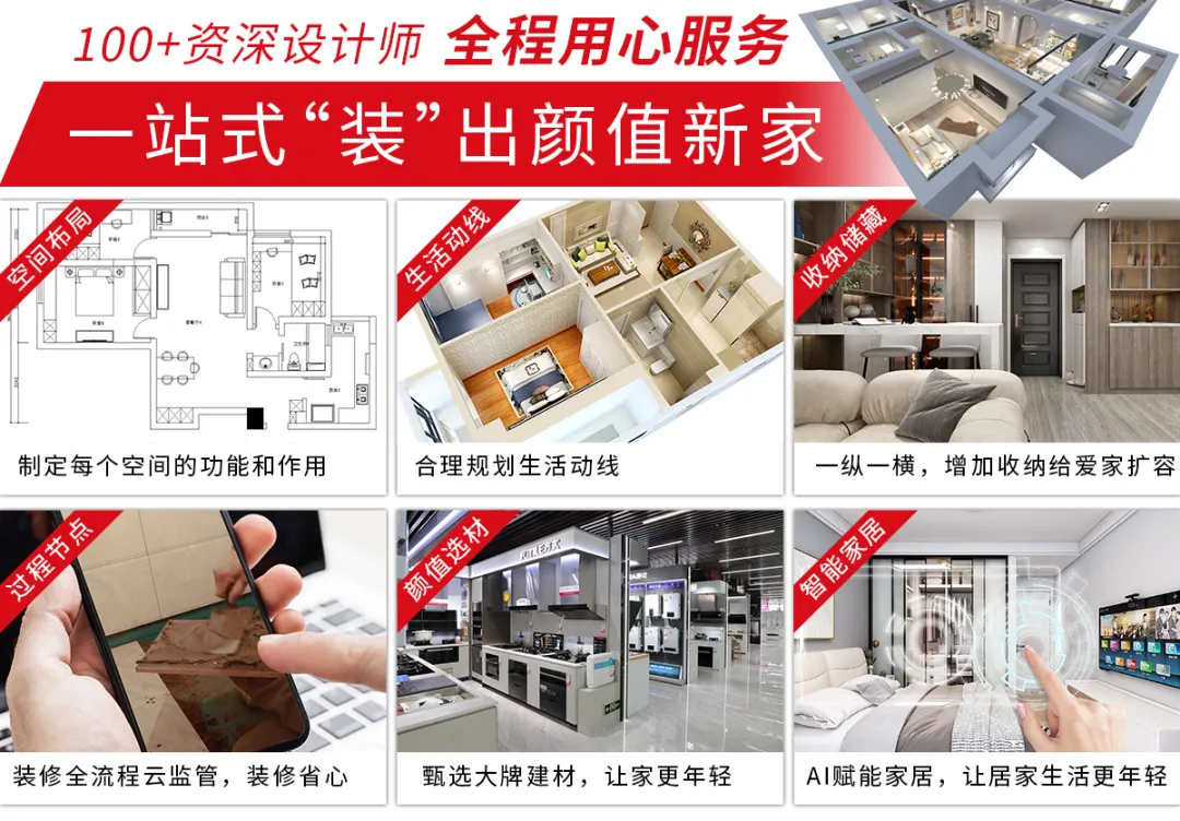 ”免費量房,免費出清單式報價“,100+精英設計師一對一專屬服務,從設計方案、選材溝通到施工問題處理,全程一站式跟進,有求必應。