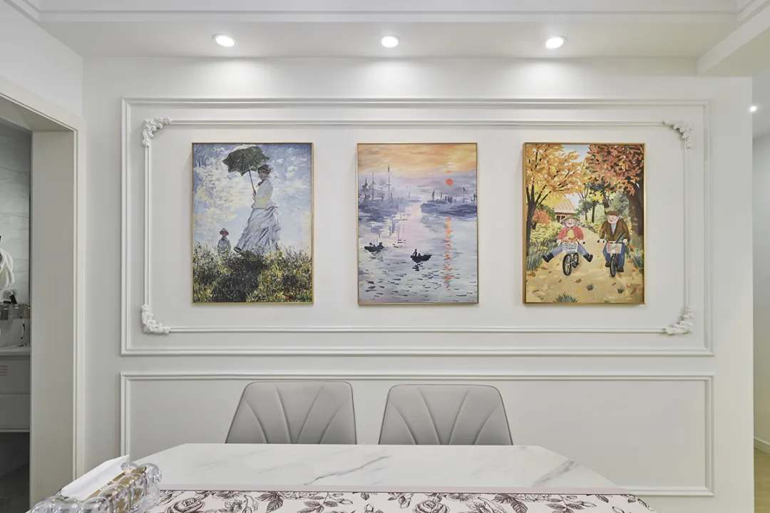 傳統(tǒng)歐式風(fēng)格的線(xiàn)條往往復(fù)雜而繁復(fù),但在現(xiàn)代歐式裝修中,我們更強(qiáng)調(diào)線(xiàn)條的克制與簡(jiǎn)約。墻面裝飾可以采用簡(jiǎn)約的石膏線(xiàn),用簡(jiǎn)單的線(xiàn)條勾勒出空間的輪廓,取代那些復(fù)雜的雕花裝飾,既保留了歐式風(fēng)格的精致感,又顯得更加簡(jiǎn)潔、大氣。在柜門(mén)的選擇上,細(xì)框回字形的款式是個(gè)不錯(cuò)的選擇,它精致而不厚重,能夠?yàn)檎麄€(gè)空間增添一份優(yōu)雅的氣質(zhì)。