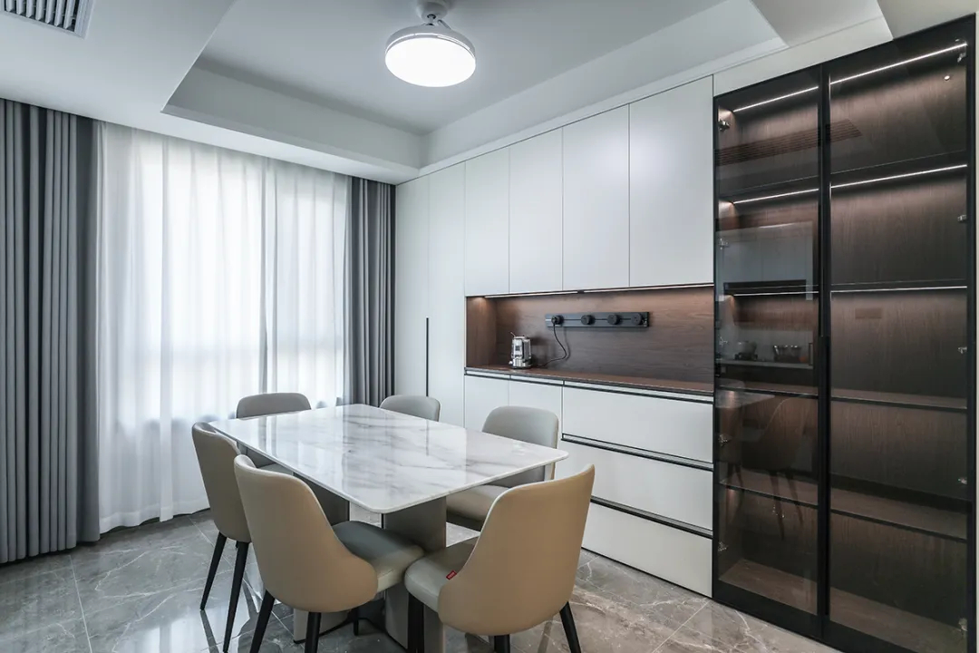 靠墻定制了一排裝飾柜,既增加了儲物空間,又通過原木色框架、極窄邊框玻璃門和白色木門板的巧妙搭配,增添了裝飾性。