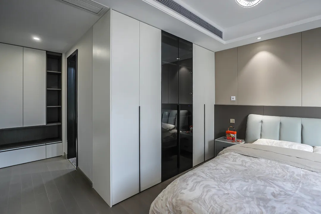 客戶希望主臥能保持原有的溫馨氛圍,同時展現出現代簡約風格。我們保留了主臥的實木地板,選擇深色床和衣柜門板與之搭配,既保持了空間的連貫性,又避免了突兀感。
